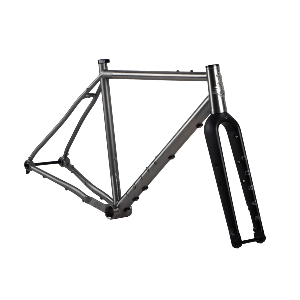 The Curve Kevin comes equipped with rear rack mounts, fender mounts, 3 x bidon mounts, and top tube “bento mounts”. With extra tyre clearance, and a comparatively long wheelbase for the gravel genre which offers a more stable platform, Kevin is ready for epic day rides or multi-day bikepacking adventures, not just smooth gravel cruising.